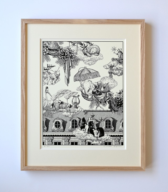 【Nighttime Parade】 夜空をたくさんの動物たちがそれぞれのスタイルで賑やかにパレードしています こちらの作品はデジタルプリント作品になります。 エディション:6/80(サイン入り) 線画を用いて細かく描き込んだモノクロのイラストに少し黄みがかった優しい風合いの紙を使用しています。 シンプルな額装なのでどんなお部屋にも合わせやすいです。 こちらは額とセットの販売価格になります。 額は無垢と黒の2色ございます。お部屋に合う色をお選びください! シートのみご希望の方、その他の額に変更されたい方はメッセージ等でご相談ください。 【サイズ】 額縁サイズ 364mm☓440mm☓22mm(外寸) 縦359mm 横288mm(シートサイズ) 表面カバー UVカットアクリル 額縁の紐付き 重量:約1.3kg 【発送】 ヤマト宅急便にてお届けします。受け取り日時や時間帯のご指定がある場合は、注文の際に備考欄にご記入ください。 その他、何かご不明な点や質問がございましたら、ぜひお気軽にお問い合わせください。