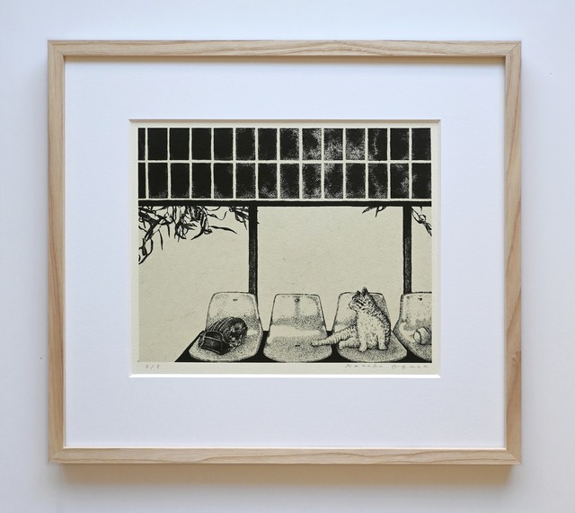 額入り絵画 【猫と野球】 野球のスコアボードの下にあるベンチでゆったりくつろぐ猫 こちらの作品はリトグラフ作品になります。 エディション:2/5(サイン入り) 制作年:2023 リトグラフで印刷した雁皮紙をハーネミューレ紙に貼り込んだ作品です。 非常に薄い雁皮紙によりほんのり若草色で、和紙独特の風合いが感じられます。 リトグラフ用のインクを用い点描で描きました。 【サイズ】 額縁サイズ 396mm☓356mm☓22mm 窓サイズ 260mm☓215mm 表面カバー UVカットアクリル 額縁の紐付き こちらの商品は特注額とセットの販売になります。 【発送】 ヤマト宅急便 受け取り日時、時間帯のご指定などがある場合は、注文の際備考欄にご記入ください。 その他、ご不明な点や質問等ございましたらお気軽にお問い合わせください。