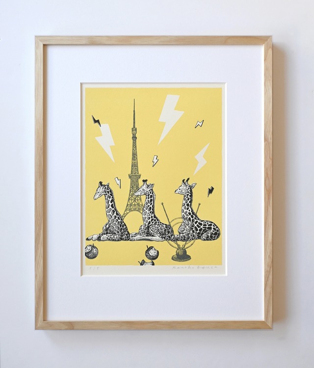 額入り絵画 【operators】 頭のツノを使って電波の中継をする三匹のキリンを描いたリトグラフ作品 エディション:1/5(サイン入り) 制作年:2025 紙:アルシュ紙 【サイズ】 額縁サイズ 388mm×466mm☓22mm 画面サイズ 220mm×280mm 表面カバー UVカットアクリル 額縁の紐付き こちらの商品は額とセットの販売になります。 シートのみの販売、額縁の変更をご希望の方はお問い合わせください。 【発送】 ヤマト宅急便 受け取り日時、時間帯のご指定などがある場合は、注文の際備考欄にご記入ください。 その他、ご不明な点や質問等ございましたらお気軽にお問い合わせください。