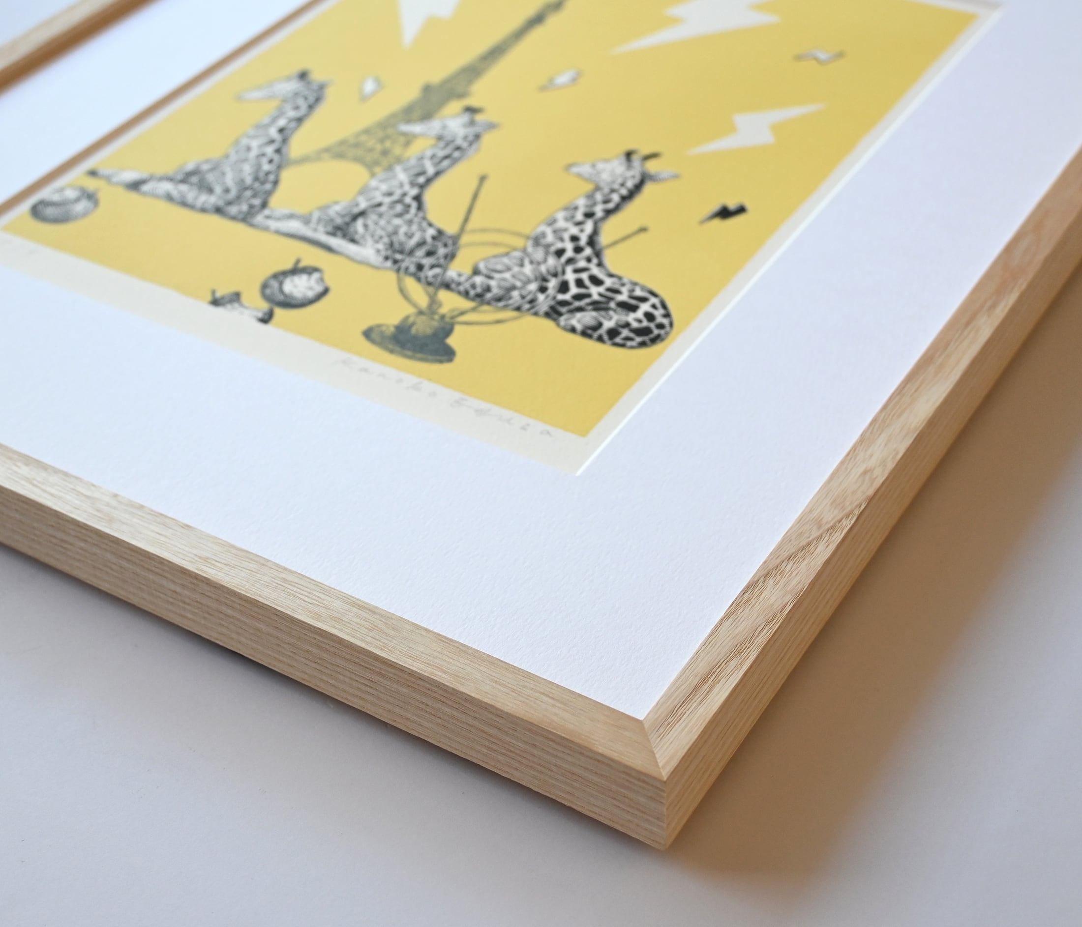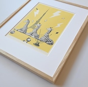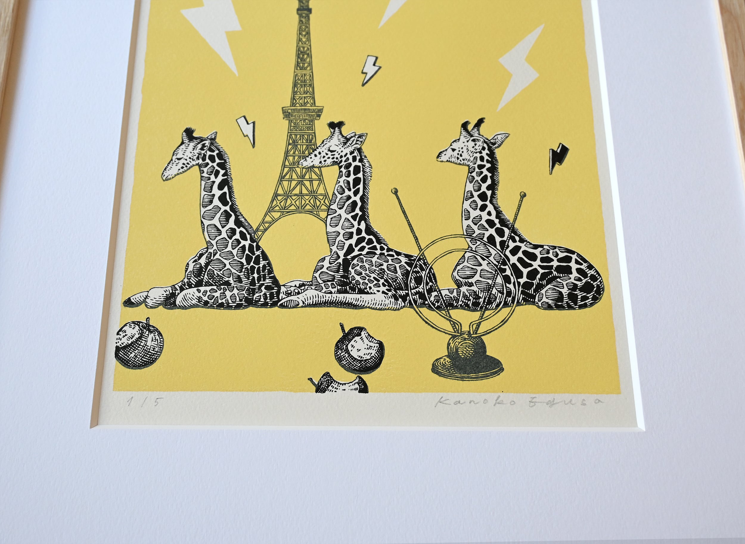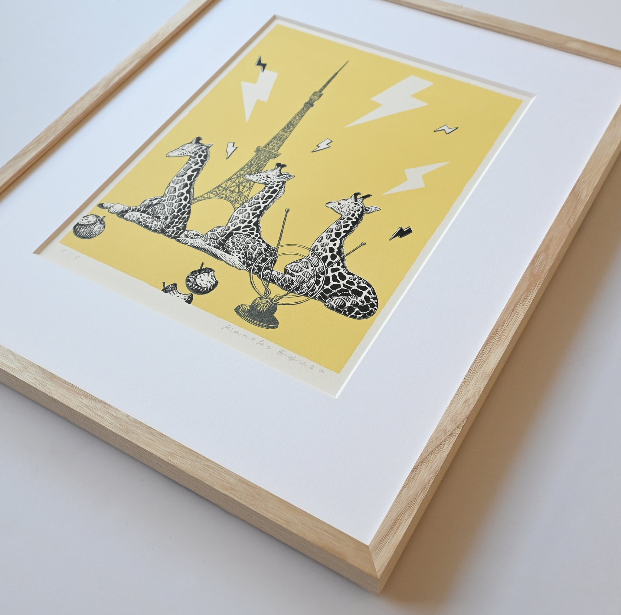 頭のツノを使って電波の中継をする三匹のキリンを描いたリトグラフ作品
